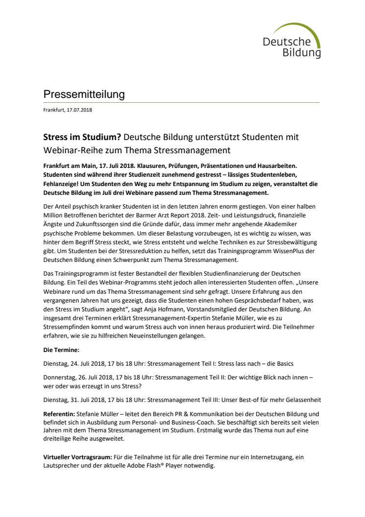 Stress im Studium? Deutsche Bildung unterstützt Studenten mit Webinar-Reihe zum Thema Stressmanagement