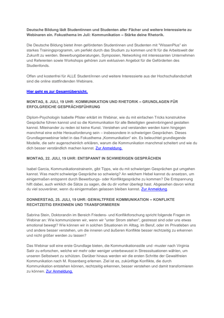 Deutsche Bildung lädt Studentinnen und Studenten aller Fächer und weitere Interessierte zu Webinaren ein. Fokusthema im Juli: Kommunikation – Stärke deine Rhetorik.