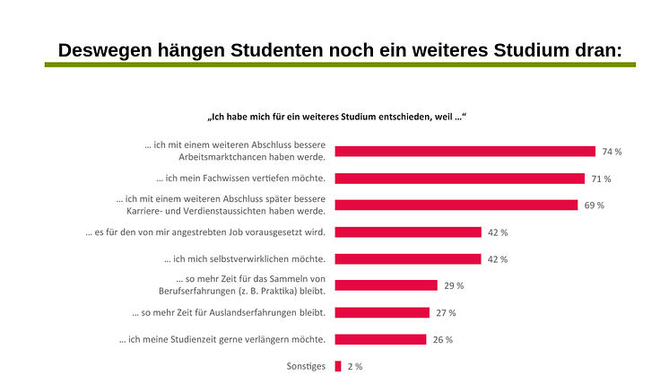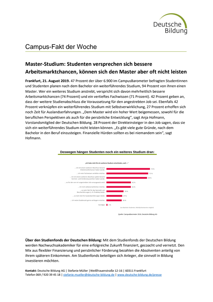 47 Prozent der über 6.900 im CampusBarometer befragten Studentinnen und Studenten planen nach dem Bachelor ein weiterführendes Studium, 94 Prozent von ihnen einen Master. Wer ein weiteres Studium anstrebt, verspricht sich davon mehrheitlich bessere Arbeitsmarktchancen (74 Prozent) und ein vertieftes Fachwissen (71 Prozent). 42 Prozent geben an, dass der weitere Studienabschluss die Voraussetzung für den angestrebten Job sei. Ebenfalls 42 Prozent verknüpfen ein weiterführendes Studium mit Selbstverwirklichung, 27 Prozent erhoffen sich noch Zeit für Auslandserfahrungen. „Dem Master wird ein hoher Wert beigemessen, sowohl für die beruflichen Perspektiven als auch für die persönliche Entwicklung“, sagt Anja Hofmann, Vorstandsmitglied der Deutschen Bildung. 28 Prozent der Direkteinsteiger in den Job sagen, dass sie sich ein weiterführendes Studium nicht leisten können. „Es gibt viele gute Gründe, nach dem Bachelor in den Beruf einzusteigen. Finanzielle Hürden sollten es bei niemandem sein“, sagt Hofmann.