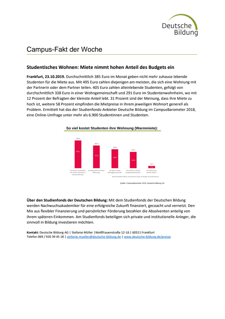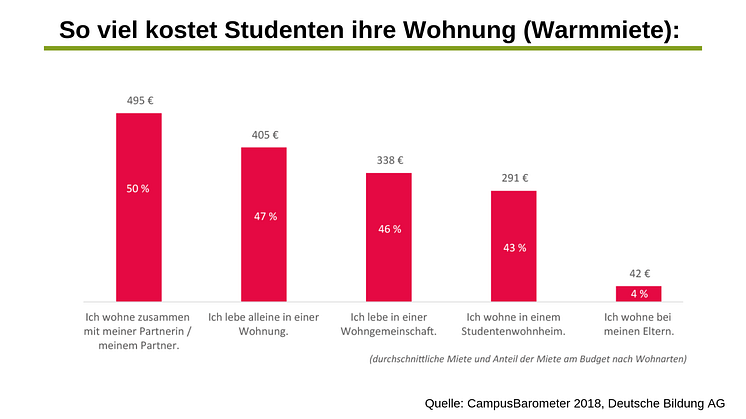 Durchschnittlich 385 Euro im Monat geben nicht mehr zuhause lebende Studenten für die Miete aus. Mit 495 Euro zahlen diejenigen am meisten, die sich eine Wohnung mit der Partnerin oder dem Partner teilen. 405 Euro zahlen alleinlebende Studenten, gefolgt von durchschnittlich 338 Euro in einer Wohngemeinschaft und 291 Euro im Studentenwohnheim, wo mit 12 Prozent der Befragten der kleinste Anteil lebt. 31 Prozent sind der Meinung, dass ihre Miete zu hoch ist, weitere 58 Prozent empfinden die Mietpreise in ihrem jeweiligen Wohnort generell als Problem. Ermittelt hat das der Studienfonds-Anbieter Deutsche Bildung im CampusBarometer 2018, eine Online-Umfrage unter mehr als 6.900 Studentinnen und Studenten.