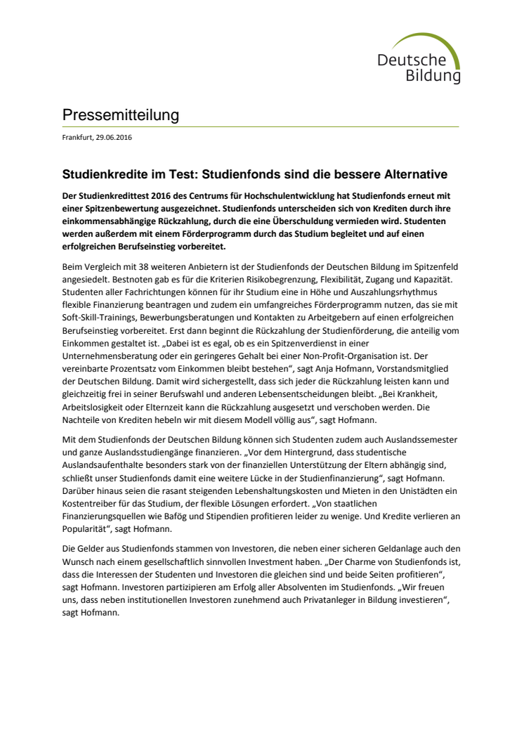 Frankfurt am Main, 29. Juni 2016. Beim Vergleich mit 38 weiteren Anbietern ist der Studienfonds der Deutschen Bildung im Spitzenfeld angesiedelt. Bestnoten gab es für die Kriterien Risikobegrenzung, Flexibilität, Zugang und Kapazität. Studenten aller Fachrichtungen können für ihr Studium eine in Höhe und Auszahlungsrhythmus flexible Finanzierung beantragen und zudem ein umfangreiches Förderprogramm nutzen, das sie mit Soft-Skill-Trainings, Bewerbungsberatungen und Kontakten zu Arbeitgebern auf einen erfolgreichen Berufseinstieg vorbereitet. Erst dann beginnt die Rückzahlung der Studienförderung, die anteilig vom Einkommen gestaltet ist. „Dabei ist es egal, ob es ein Spitzenverdienst in einer Unternehmensberatung oder ein geringeres Gehalt bei einer Non-Profit-Organisation ist. Der vereinbarte Prozentsatz vom Einkommen bleibt bestehen“, sagt Anja Hofmann, Vorstandsmitglied der Deutschen Bildung. Damit wird sichergestellt, dass sich jeder die Rückzahlung leisten kann und gleichzeitig frei in seiner Berufswahl und anderen Lebensentscheidungen bleibt. „Bei Krankheit, Arbeitslosigkeit oder Elternzeit kann die Rückzahlung ausgesetzt und verschoben werden. Die Nachteile von Krediten hebeln wir mit diesem Modell völlig aus“, sagt Hofmann.