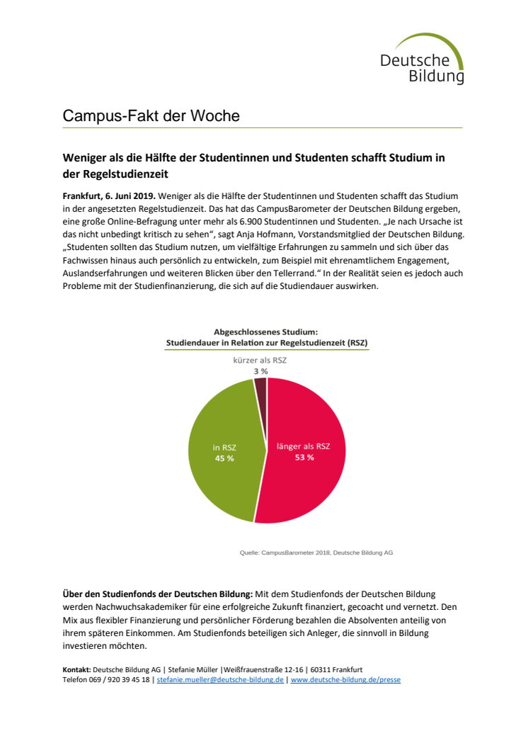 Frankfurt, 6. Juni 2019. Weniger als die Hälfte der Studentinnen und Studenten schafft das Studium in der angesetzten Regelstudienzeit. Das hat das CampusBarometer der Deutschen Bildung ergeben, eine große Online-Befragung unter mehr als 6.900 Studentinnen und Studenten. „Je nach Ursache ist das nicht unbedingt kritisch zu sehen“, sagt Anja Hofmann, Vorstandsmitglied der Deutschen Bildung. „Studenten sollten das Studium nutzen, um vielfältige Erfahrungen zu sammeln und sich über das Fachwissen hinaus auch persönlich zu entwickeln, zum Beispiel mit ehrenamtlichem Engagement, Auslandserfahrungen und weiteren Blicken über den Tellerrand.“ In der Realität seien es jedoch auch Probleme mit der Studienfinanzierung, die sich auf die Studiendauer auswirken.